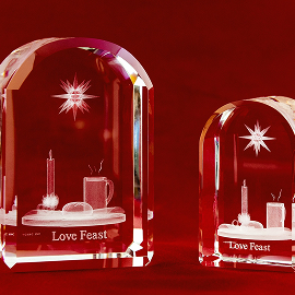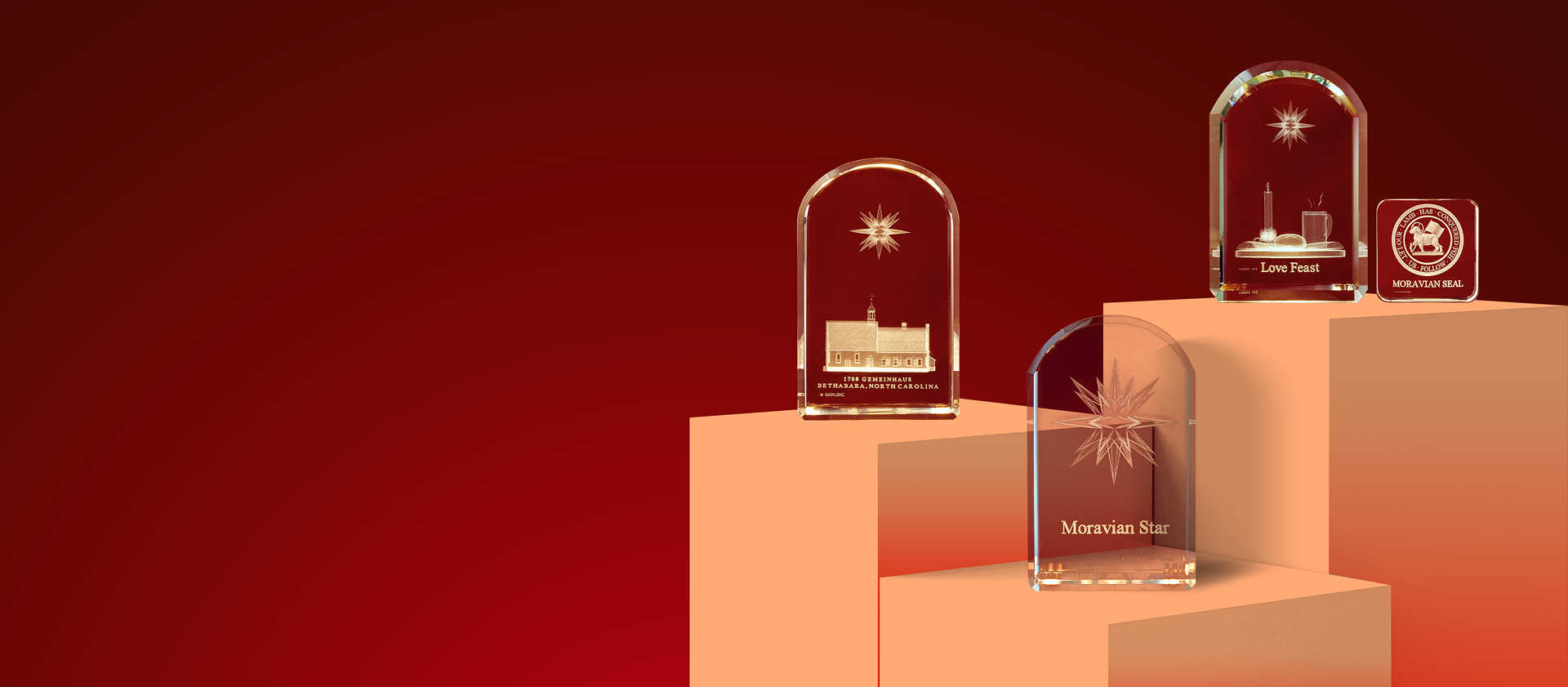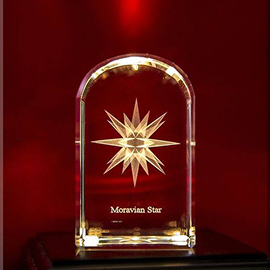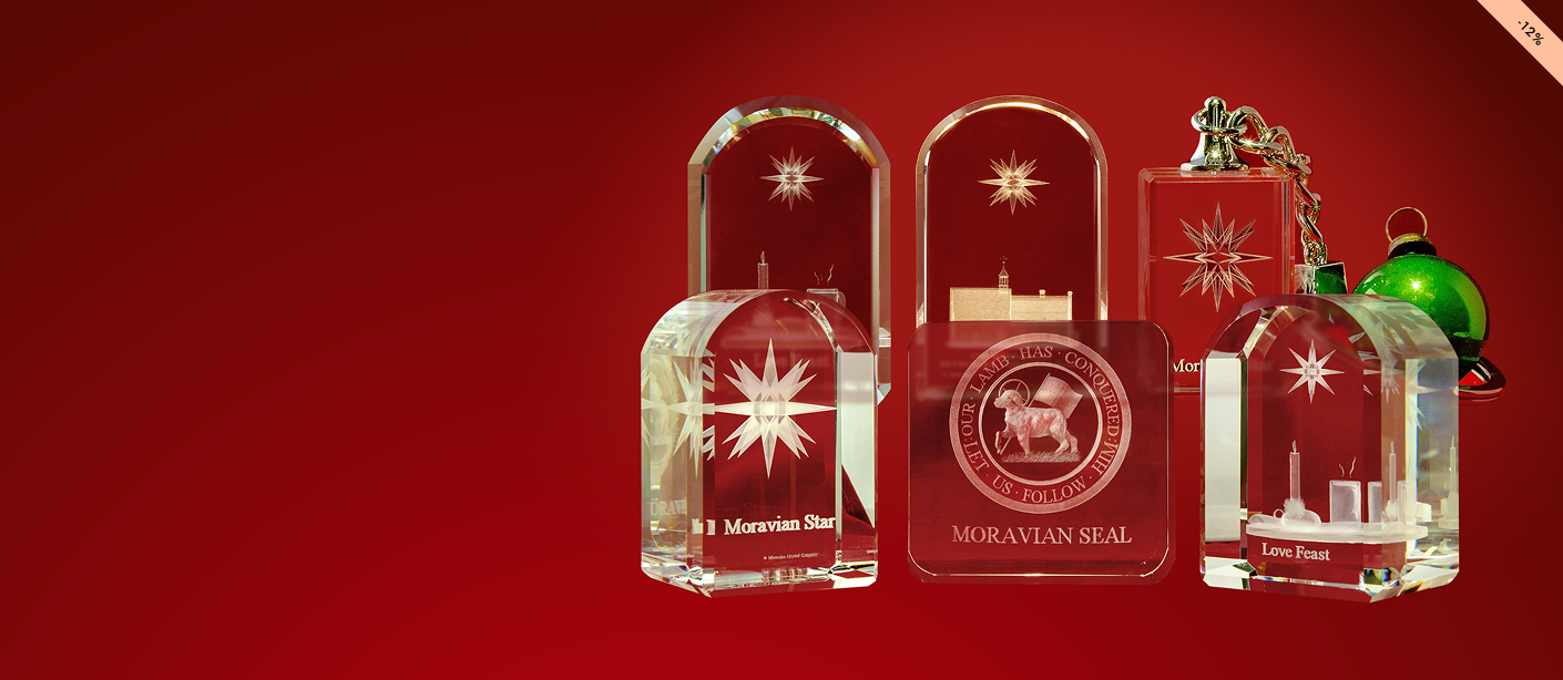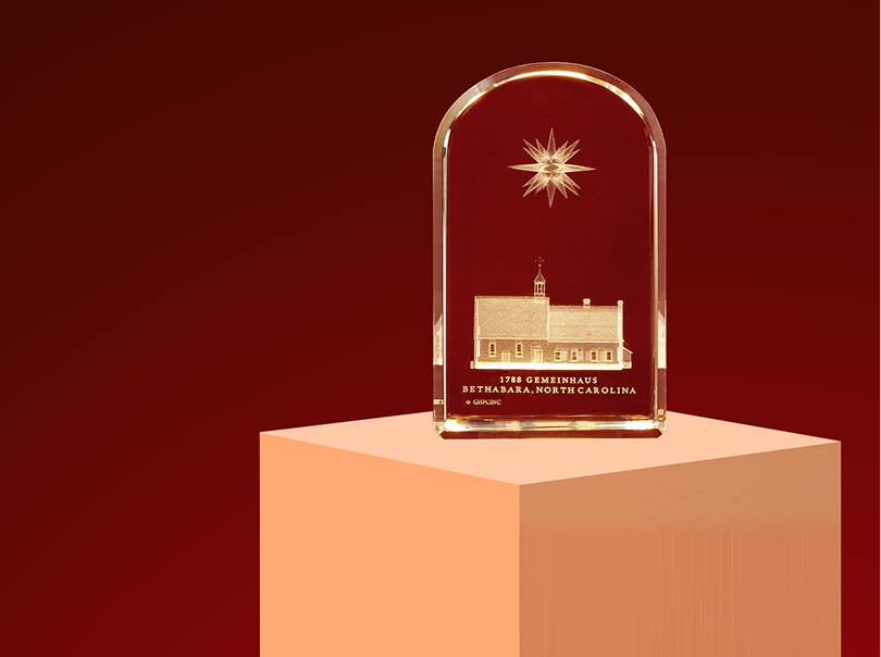 The creative content and the 3D modeling are designed locally and are inspired by simple images of the day to day life of the Moravian way. The idea of modeling local collectibles in 3D Crystal images evolved over many years. Trial and error, experimenting with different modeling techniques and the talent of B Tunde Adeyemi, were combined in creating the three piece 250th Anniversary Collection. The Love feast, the Moravian Star and the 1788 Bethabara Church are all designed with the unique Moravian “Bonnet” or eyebrow” arch, seen at the entrances to Moravian churches and homes. Other pieces in the collection will be released from time to time.