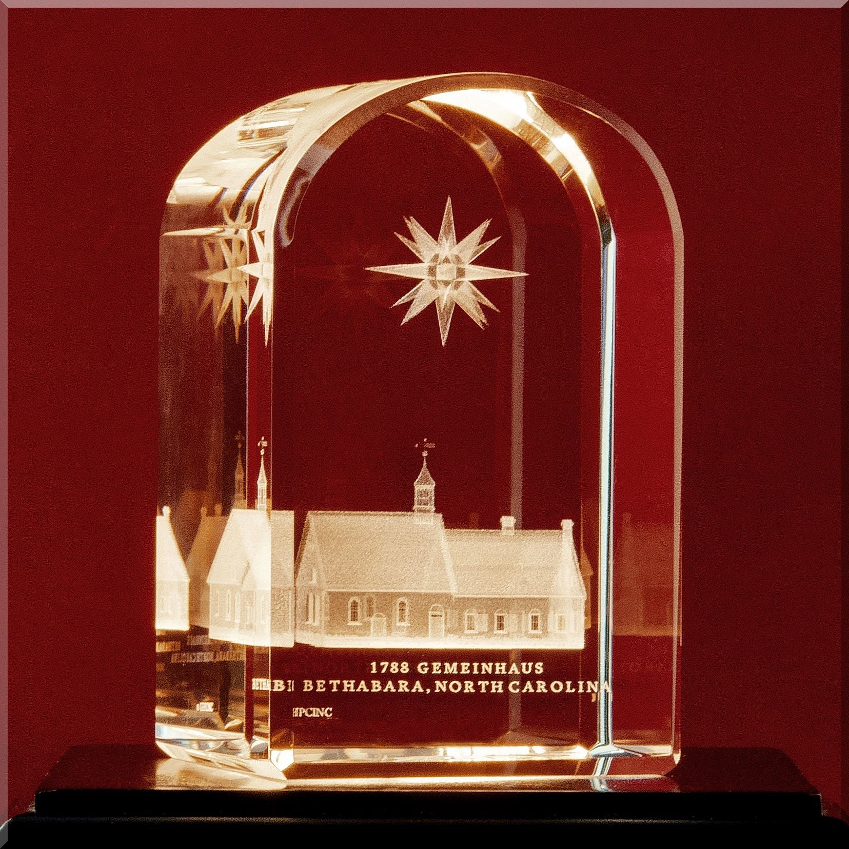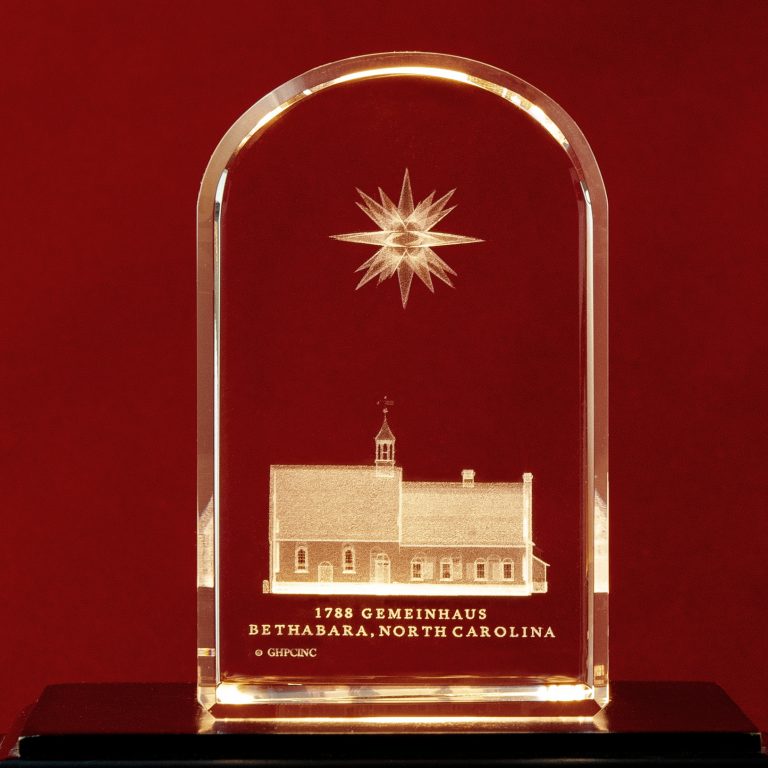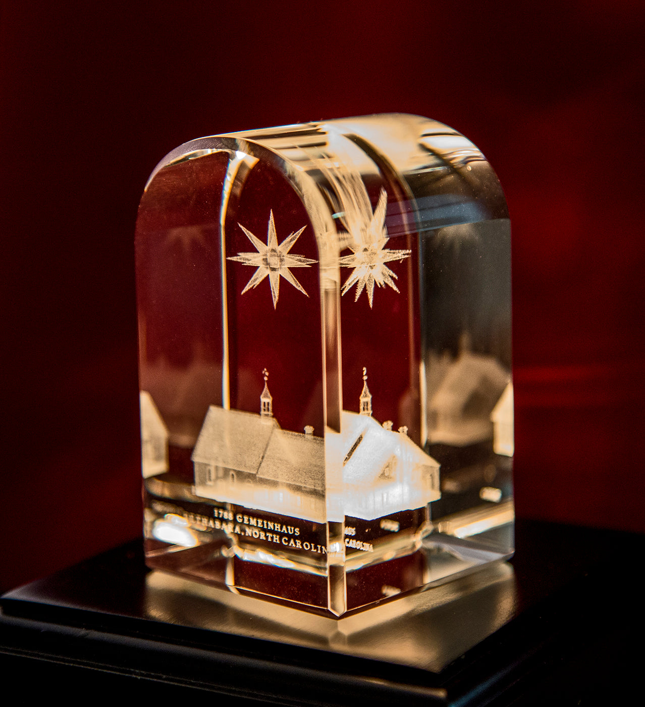 The first Moravian church built in this area is presented in miniaturized detail beneath the floating Moravian Star.