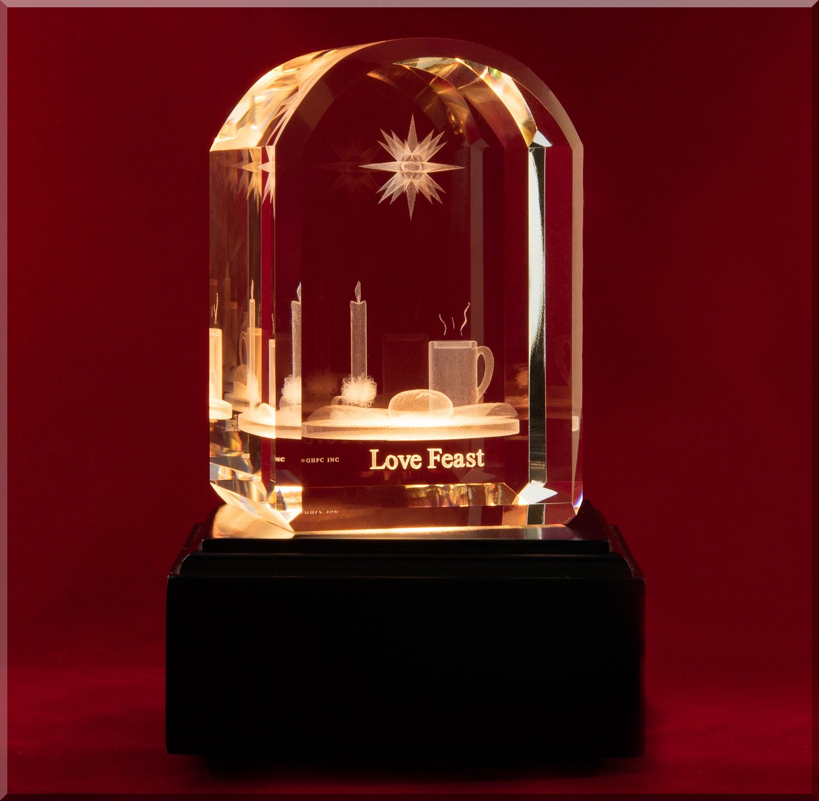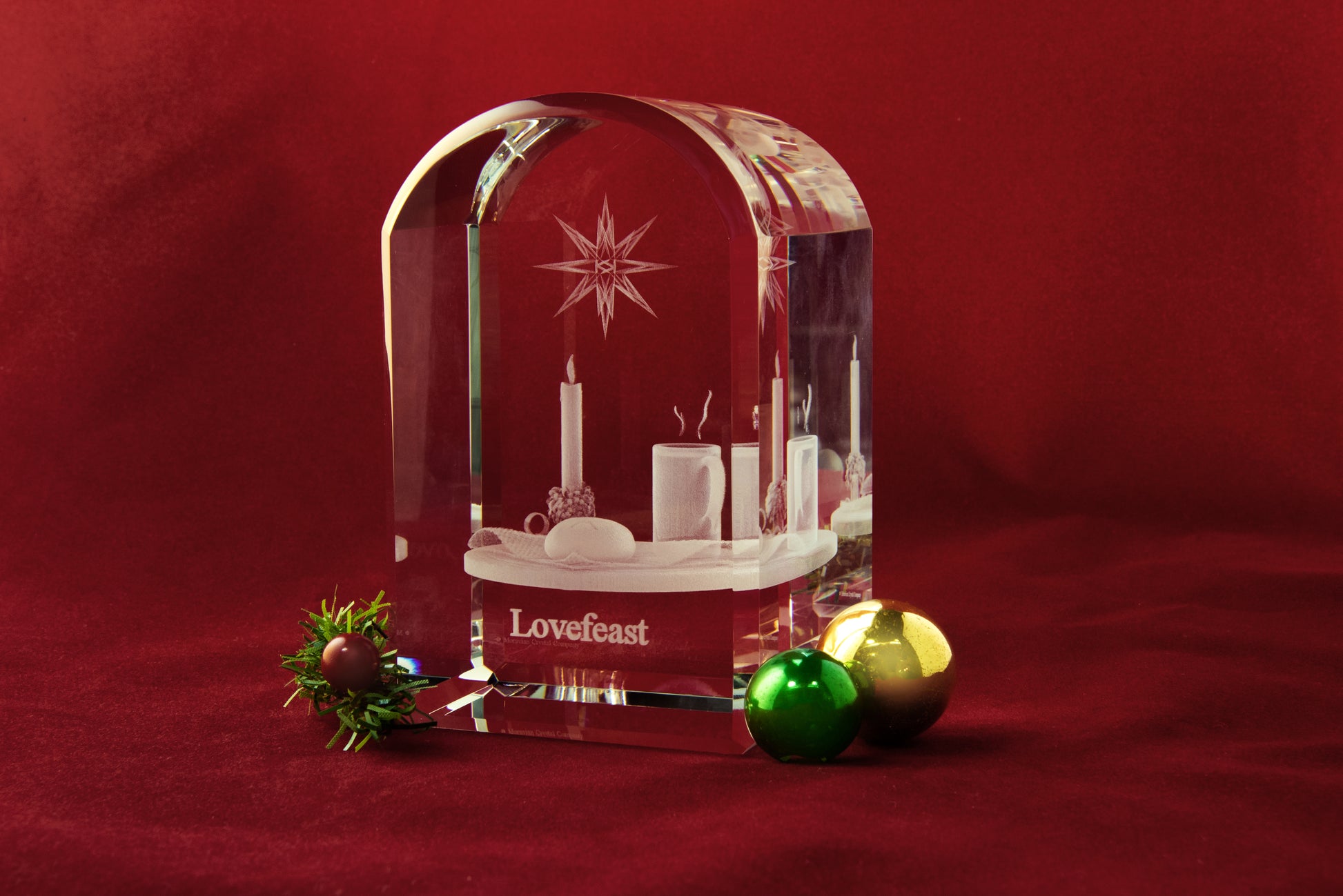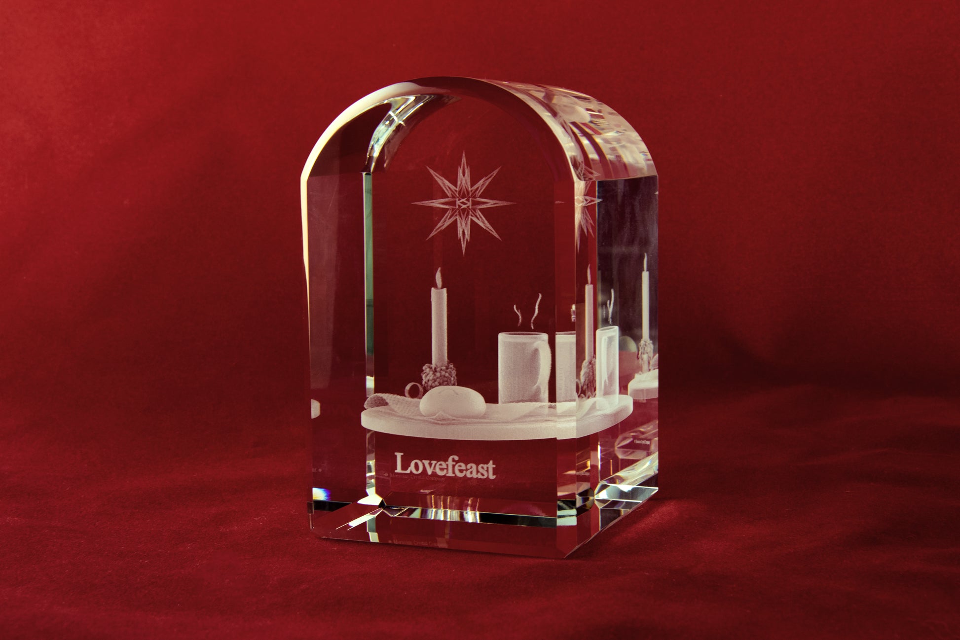A beautiful representation of the age-old tradition, the Moravian Love Feast. Captured in crystal, the level of detail includes the lighted candle, the wisps of steam rising from the coffee, the “M” on the Moravian Bun, and the fold in the napkin.